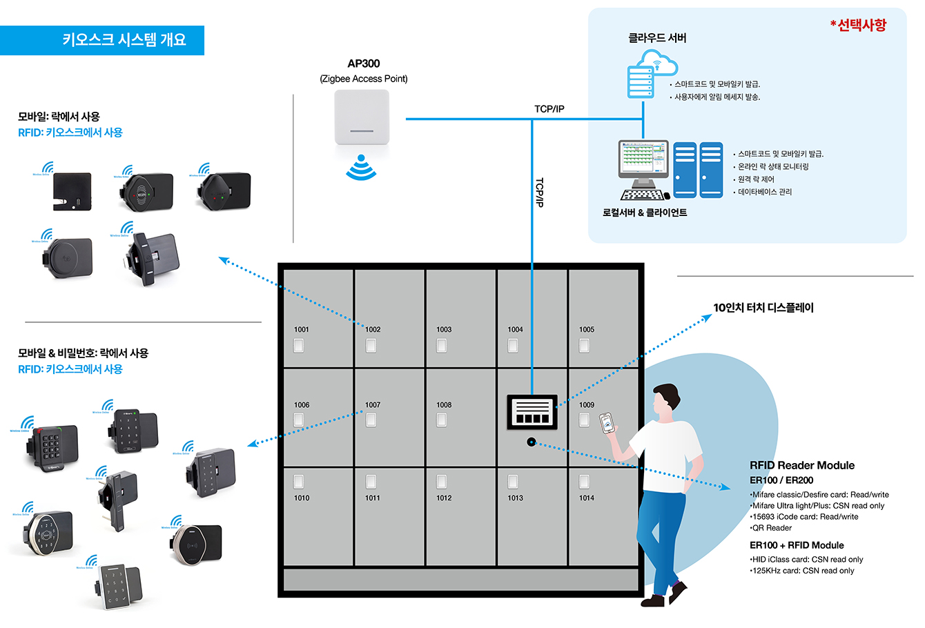 키오스크 자체 인증 (RFID 카드미사용) 솔루션 | 타사 솔루션 제공 업체 – 고객이 공급 | 터치하여 락을 깨워 열기 | AP 및 타사 서버 인터페이스 프로토콜 (락 제어) |